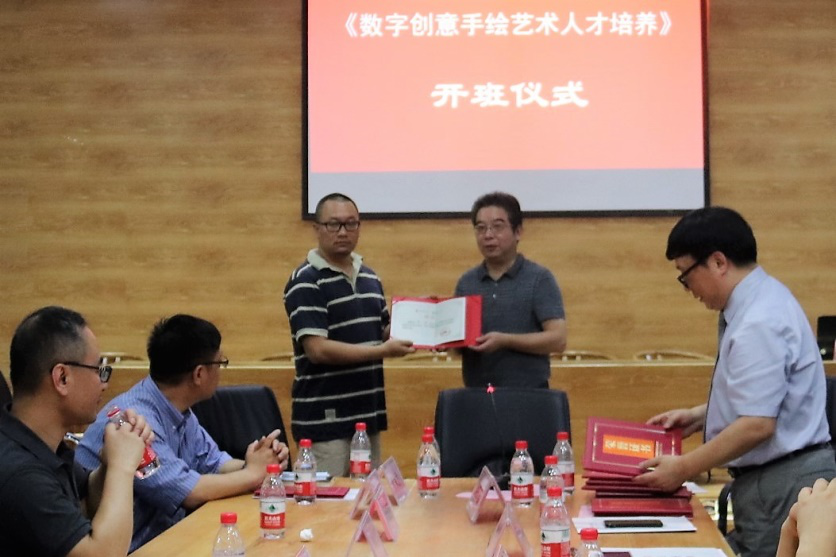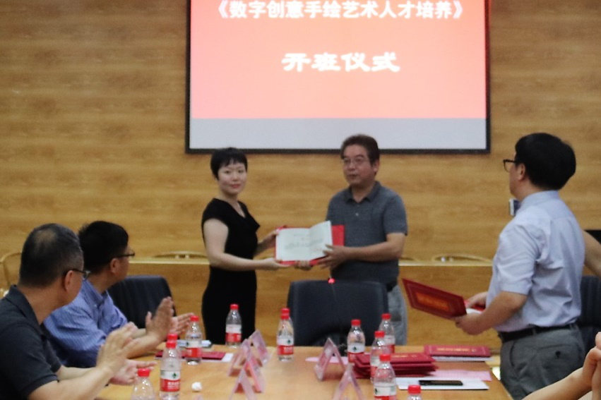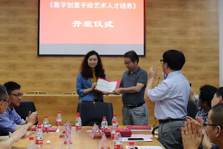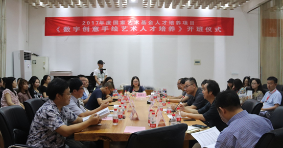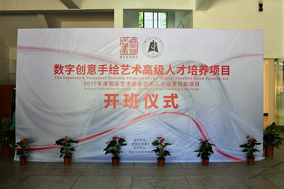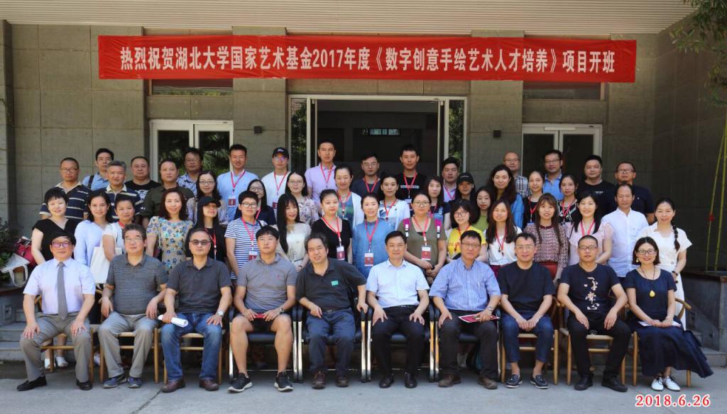 6月26日,由我校9365.com承办的国家艺术基金2017年度人才培养资助项目“数字创意手绘艺术人才培养”正式开班。湖北大学副校长顾豪爽教授、湖北省文化厅文艺处处长田松先生、华中师范大学美术学院院长徐晓庚教授、武汉纺织大学传媒学院院长沈祥胜教授、湖北美术学院工业设计系主任李梁军教授、湖北工业大学设计学院院长石元伍教授、湖北大学社科处黄江英副处长、湖北大学9365.com黄家发书记、许开强院长、马新平副院长、潘峰副院长以及武汉大学翁子扬教授、武汉纺织大学传媒学院叶科教授、中南财经政法大学新闻与传播学院动画系主任吴博教授、武汉工商学院艺术与设计学院数字媒体艺术系主任徐郑冰教授、武汉插画人辰星动漫CEO张巍先生、湖北大学尹朝阳教授、谭崇正教授、李钢教授、余日季教授、杨帆教授、王红教授、张立教授、彭茹娜教授、郑林教授、刘靖戎教授、杨高钰教授、李晶涛老师、向垚老师等数字手绘艺术领域的资深专家导师出席。
